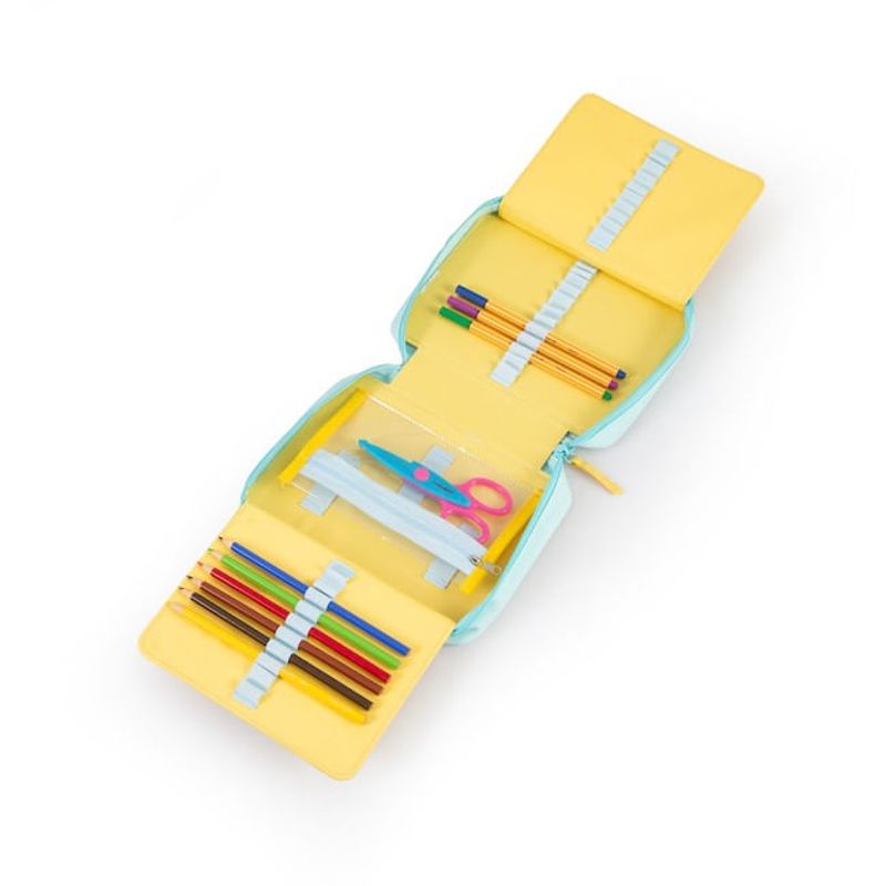 - Marca: Talbot- Nombre: Canopla Talbot Case Box Celeste 1 Cierre- Modelo: Celeste- Incluye: 1 Cierre - 1 Bolsillo interno - 50 Elásticos porta lápices - solapa divisoria - 2 bandejas desplegables - Bolsillo con cierre de PVC Transparente- Medidas: 22,5 x 17,5 x 5,5 cm.- Peso: 275 g.- Capacidad: 2 L.- Medida desplegada: 40 x 65 cm.